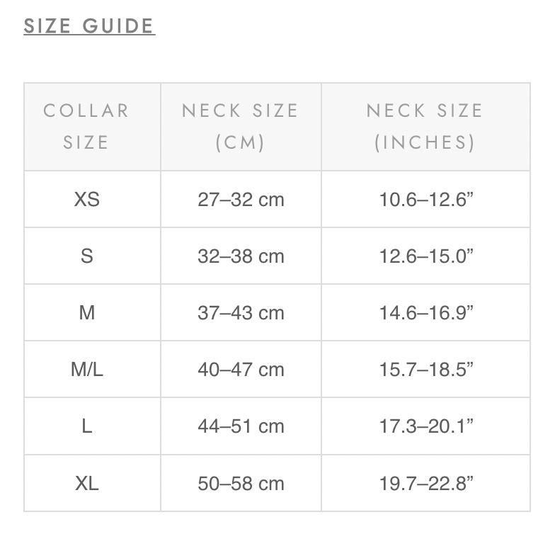 Le collier est entièrement réglable et disponible dans une gamme de tailles. Toutes les tailles se réfèrent à la circonférence du cou du chien.