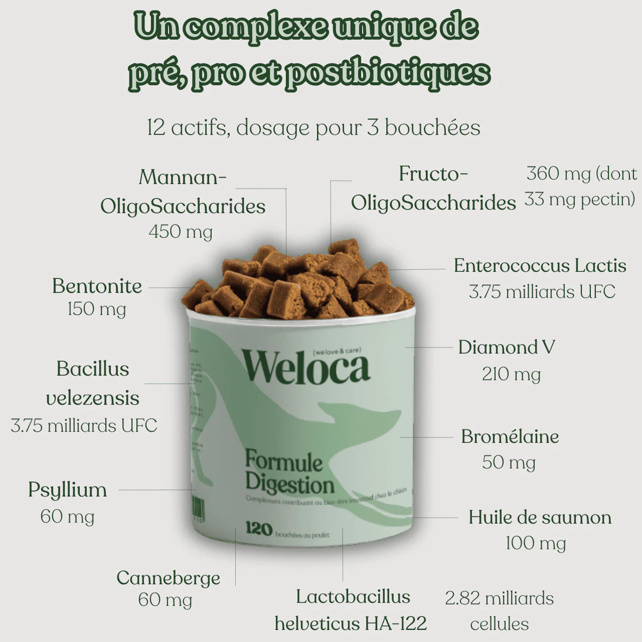 Une formule avancée qui combine prébiotiques, probiotiques et postbiotiques pour nourrir et rééquilibrer le microbiote de votre chien. Enrichie en psyllium, bromélaïne, bentonite, canneberge et huile de saumon pour un confort digestif optimal.