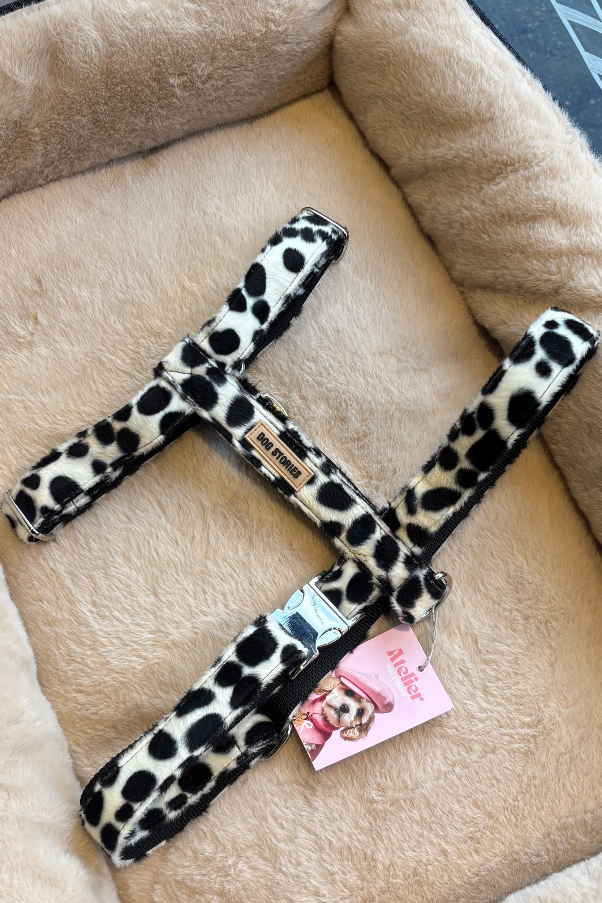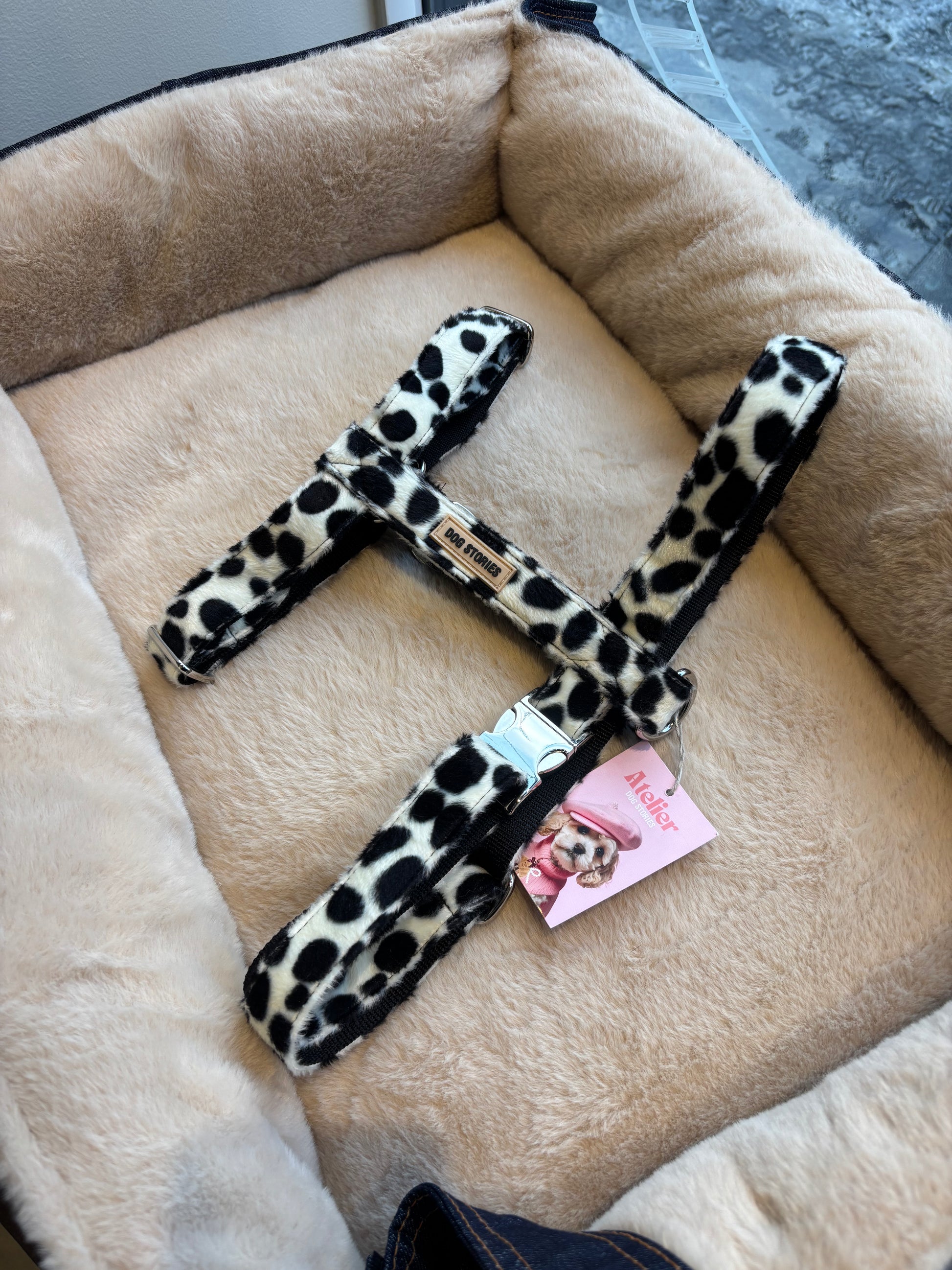 Le harnais Dalmata Dog Stories est doté d'un tissu effet fourrure blanche aux tâches noires.