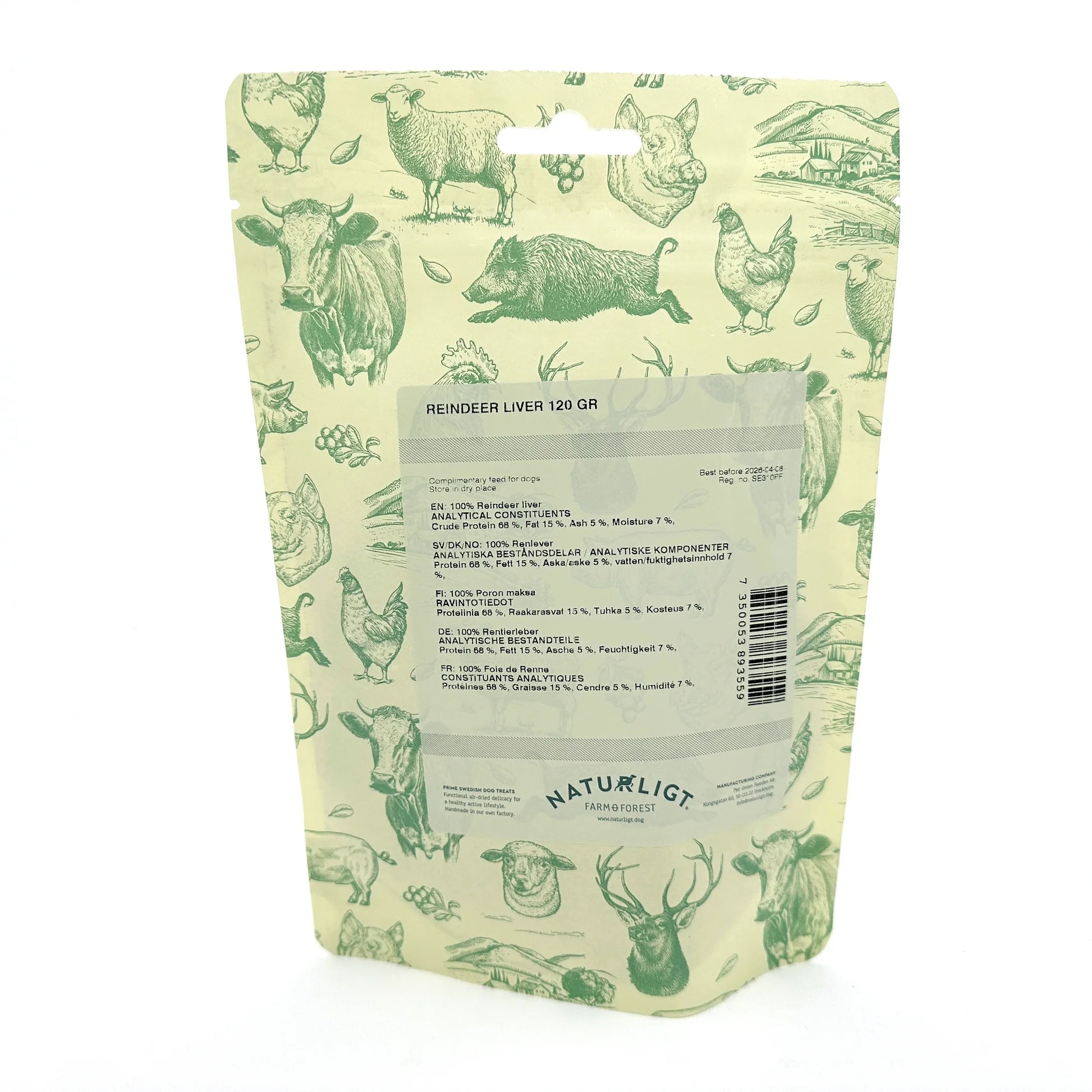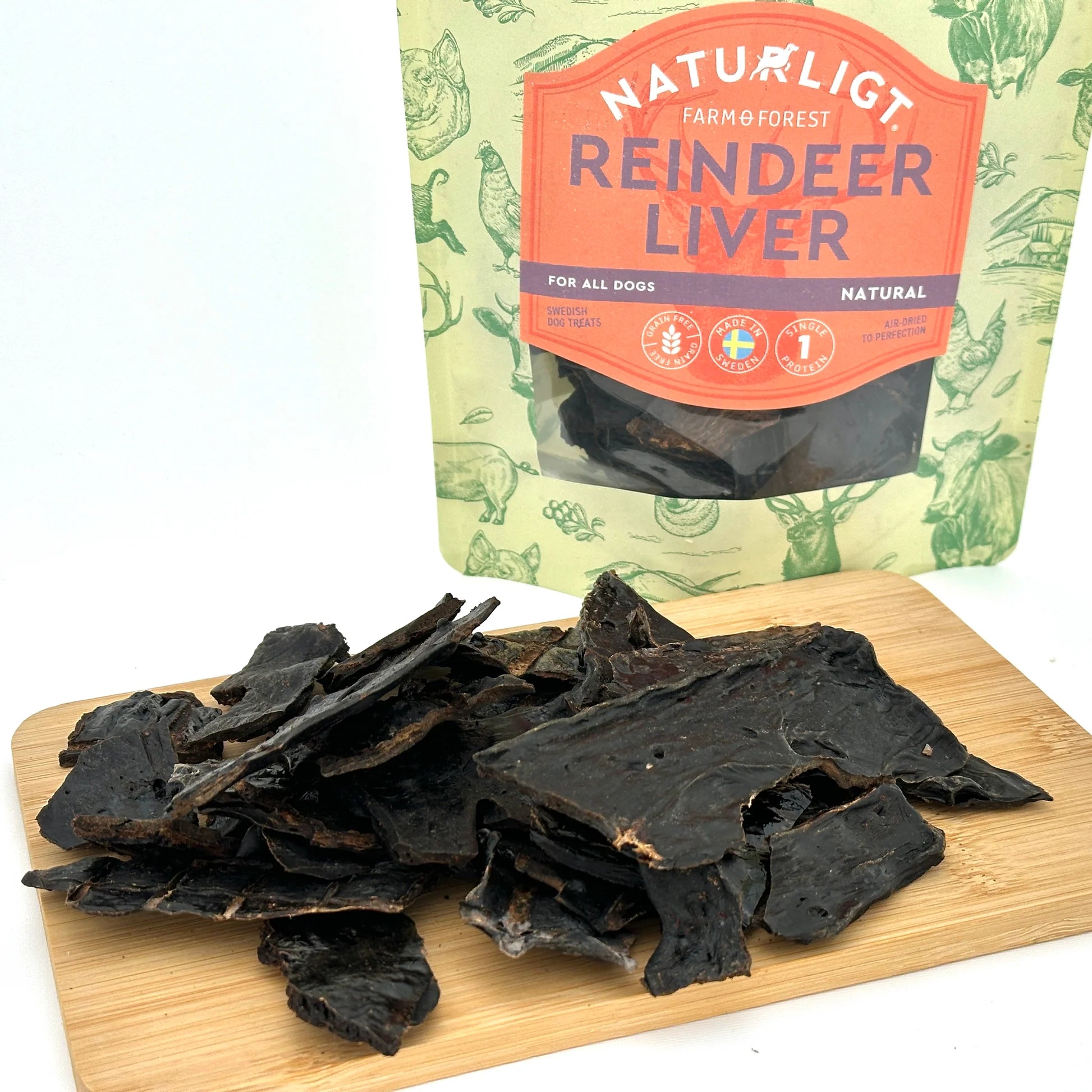 Farm & Forests Reindeer Liver est une friandise naturelle pour chiens fabriquée en Suède à partir de foie de renne 100 % suédois. Les morceaux sont croustillants et faciles à casser en morceaux à la taille souhaitée.