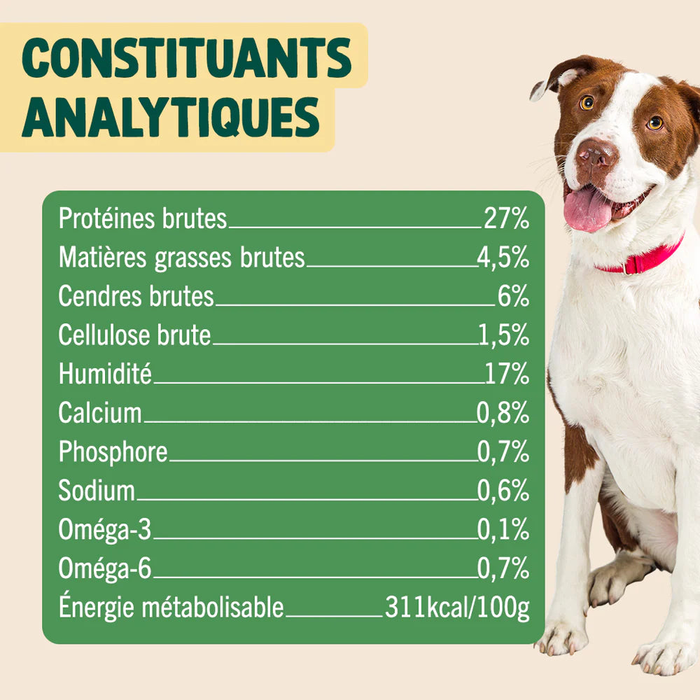 Les friandises Dinde, cheddar sont idéales pour faire plaisir à votre chien cet hiver. La dinde est une viande maigre et digeste, parfaite pour les chiens sensibles ou stérilisés. Le collagène soutient les articulations et la mobilité. Le cheddar apporte une touche savoureuse et unique. Enfin, les fibres végétales (pois, lentilles, courge), les probiotiques et l’acide fulvique soutiennent la digestion et aident à réguler le transit.
