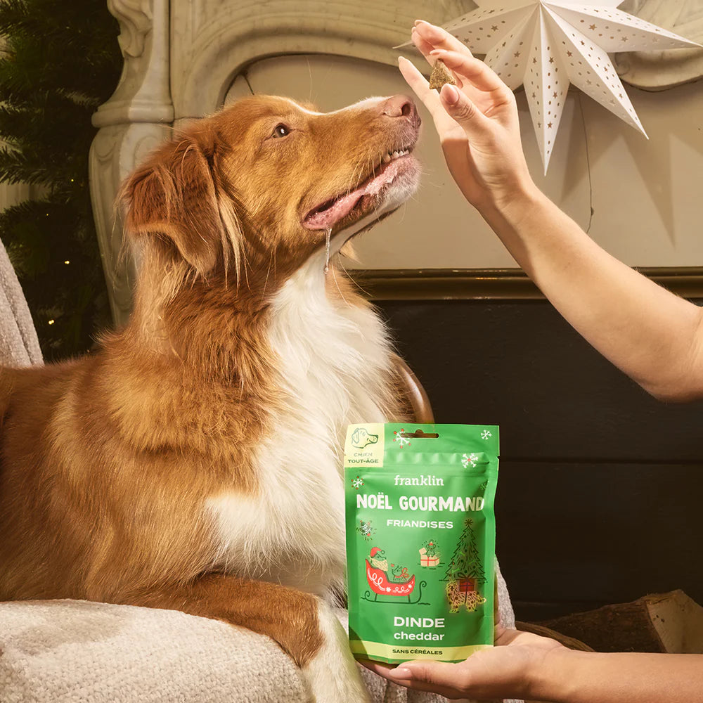 Pas question d'attendre le 24 minuit pour gâter votre chien ! Découvrez la nouvelle friandise de Noël Franklin en édition limitée. Elle est préparée avec de la dinde, digeste et riche en vitamines, et agrémentée de cheddar fondant pour un goût irrésistible. Sans oublier le collagène pour des articulations souples et des probiotiques pour un ventre heureux !