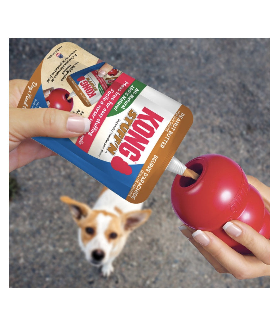 Le beurre de cacahuètes naturellement délicieux du KONG Stuff'N™, est contenu dans un sachet pratique avec avec un embout qui permet de servir proprement.