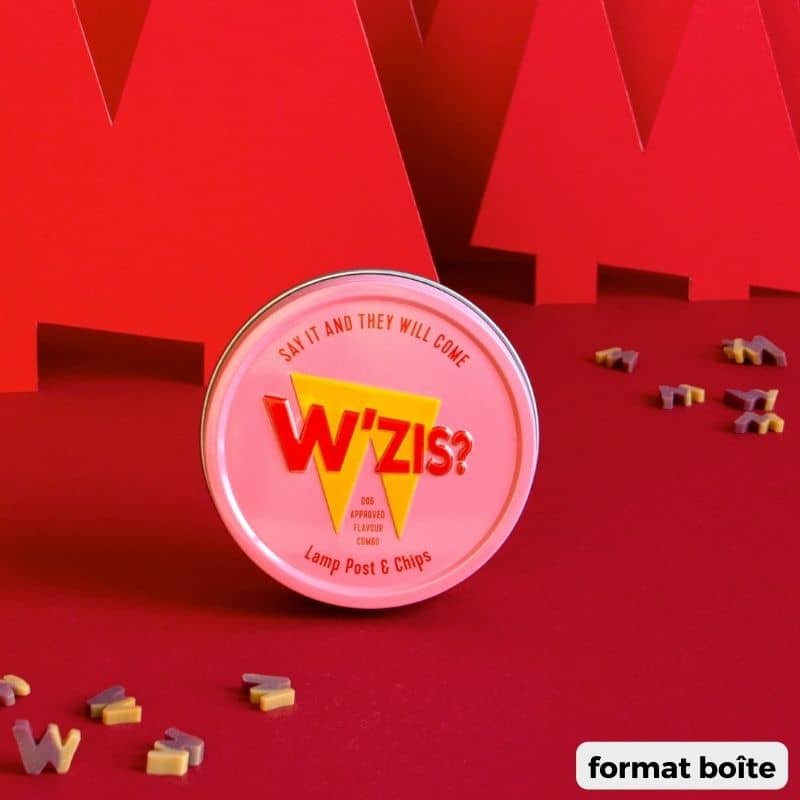 Ces friandises végétales "Lamp Post & Chips" de la marque W'zis sont sans céréales, et ont une texture volontairement ferme et une forme de W pour prolonger le temps de consommation et favoriser le nettoyage des dents.