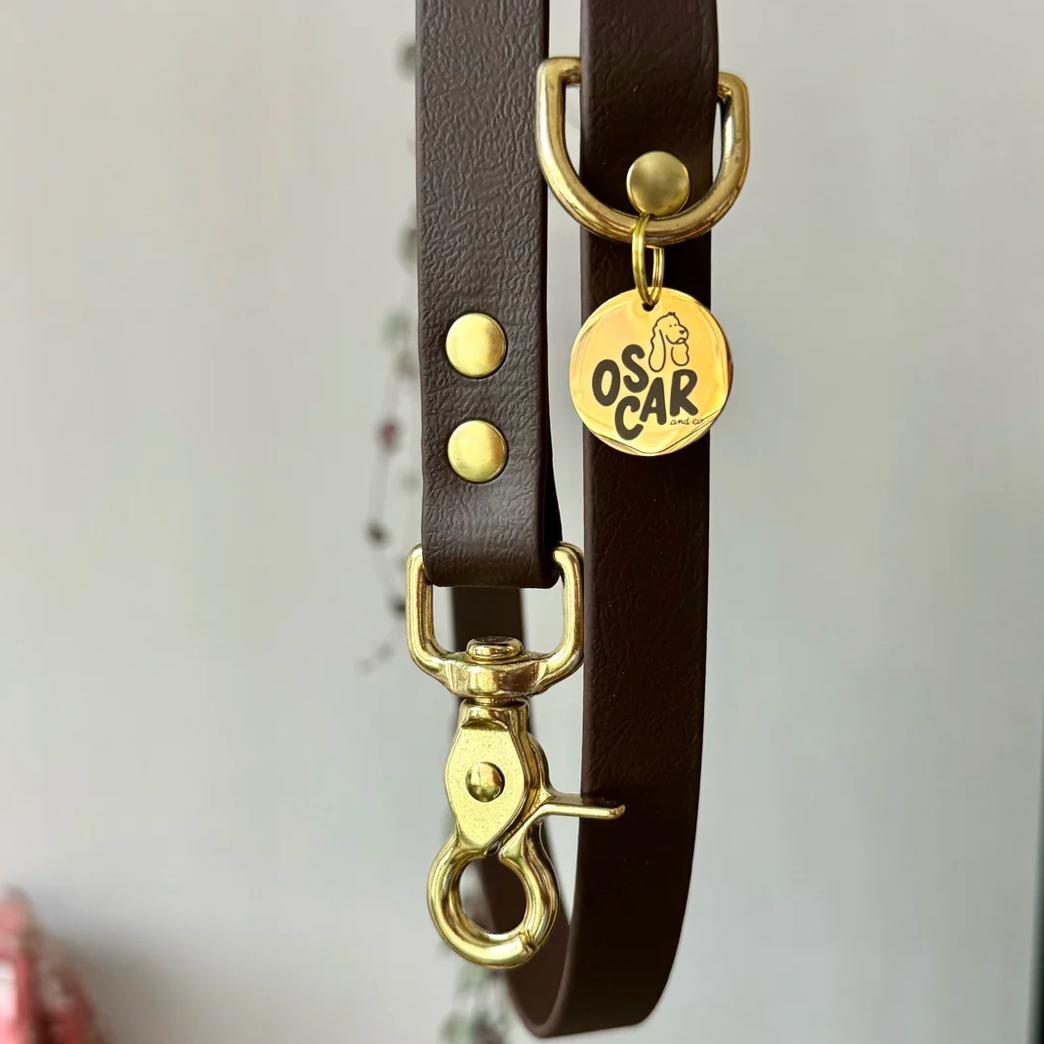 Sangle en Biothane imperméable, effet cuir mais vegan et surtout très résistant à la traction. Boucles, mousquetons, anneaux et rivets en laiton massif, couleur or