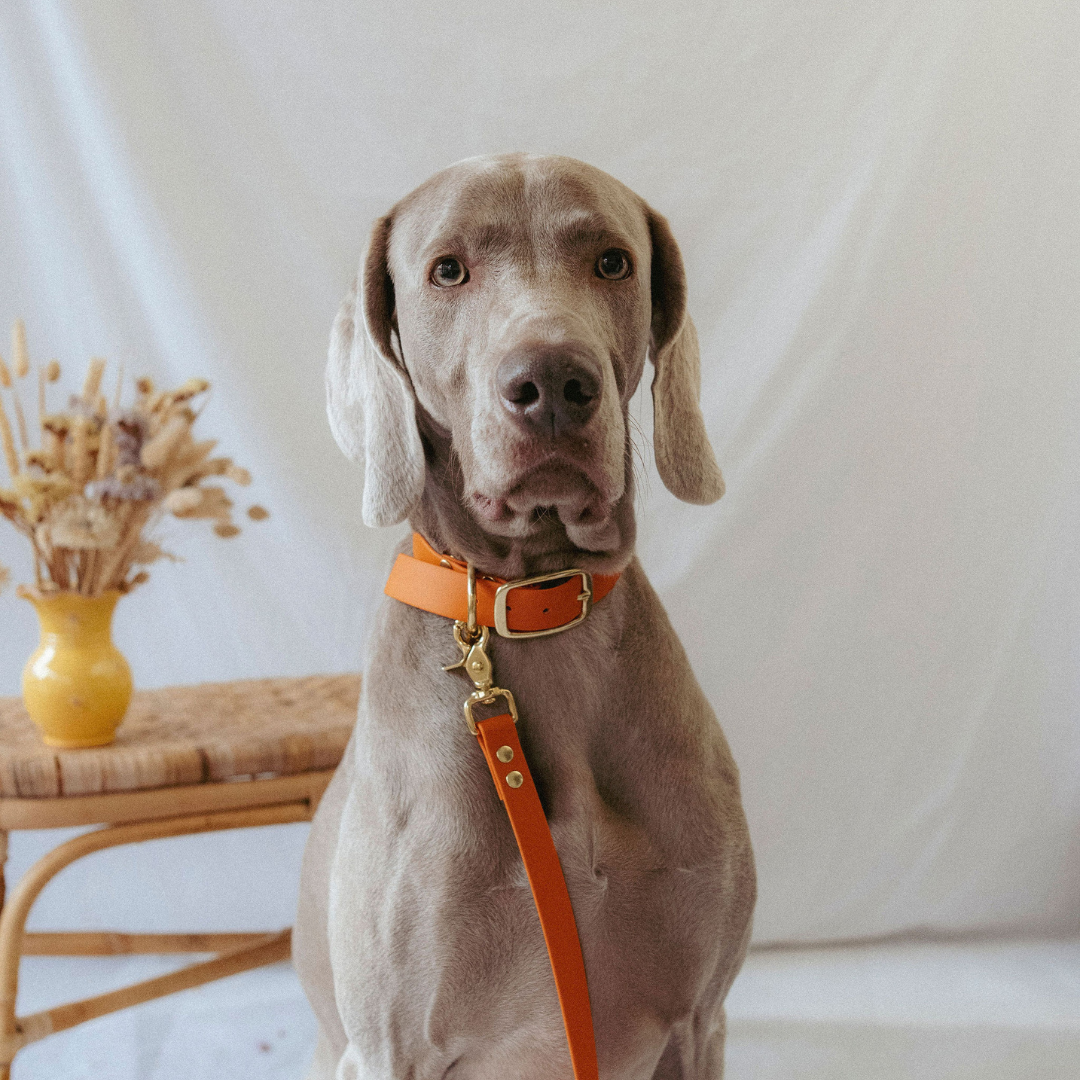 Sangle en Biothane imperméable, effet cuir mais vegan et surtout très résistant à la traction. Boucles, mousquetons, anneaux et rivets en laiton massif, couleur or
