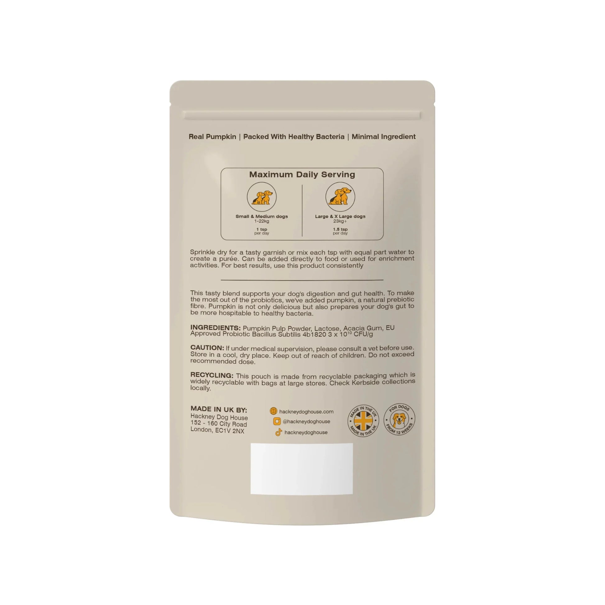 Sachet de probiotique à la citrouille, à mélanger avec un peu d'eau chaude pour une texture crémeuse à étaler sur un tapis de léchage ou à saupoudrer tel quel en topping sur son repas.