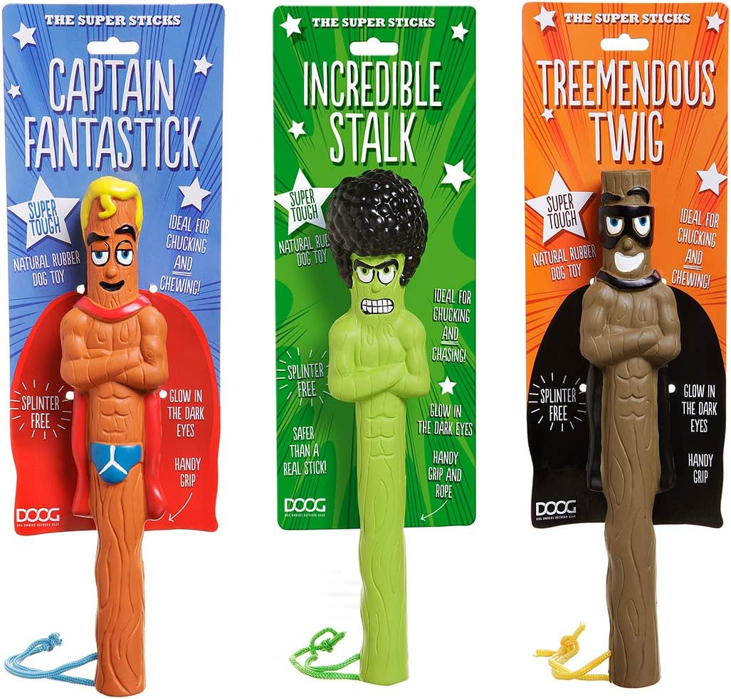 Ces bâtons super-amusants en forme de super-héros sont fabriqués en caoutchouc naturel et constituent une option beaucoup plus sûre pour votre animal que les bâtons naturels. Les Super Sticks sont dotés d'yeux qui brillent dans le noir et d'une poignée pratique pour les attraper. La corde permet d'accrocher votre Super Stick à la porte d'entrée, prêt pour sa prochaine aventure.