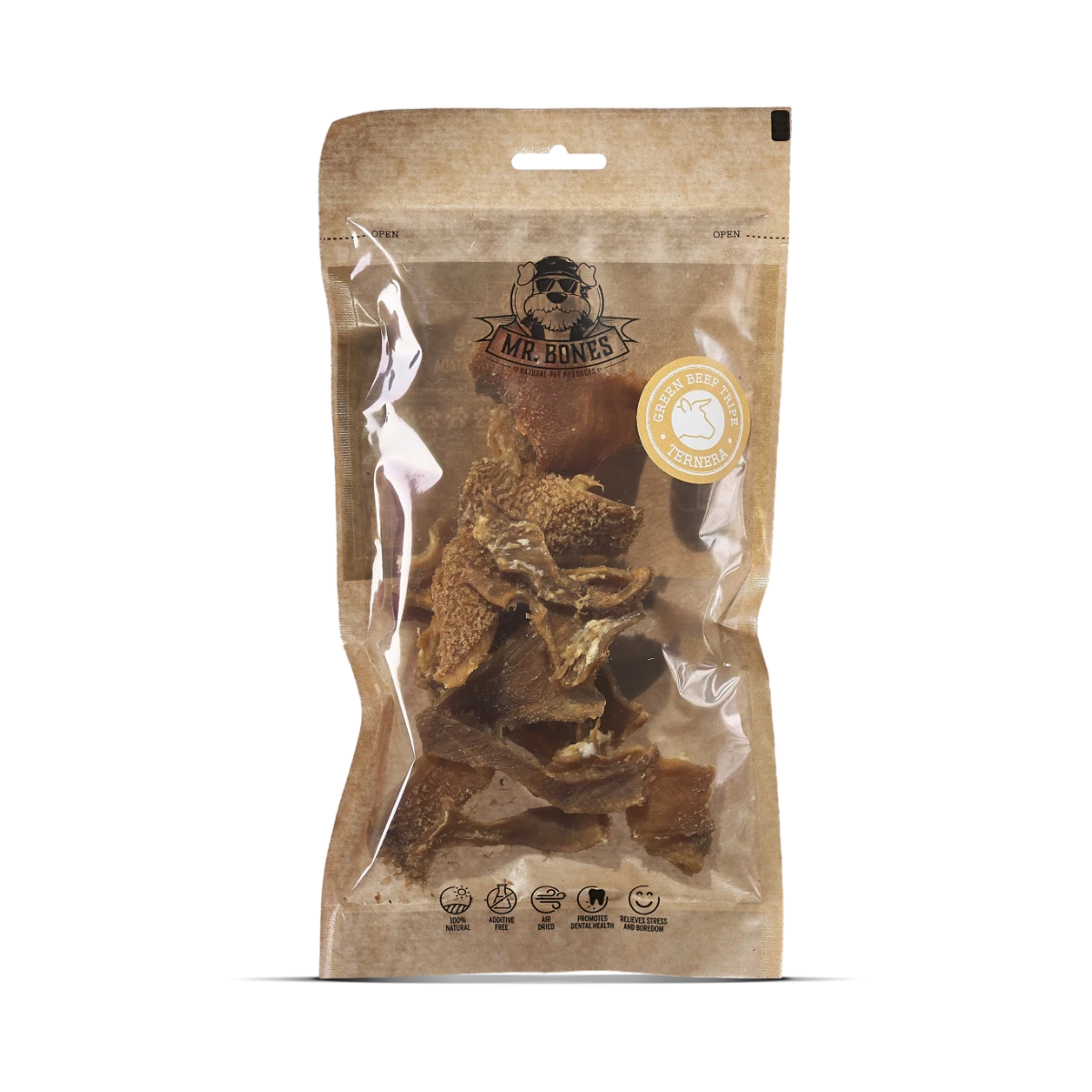 Le Tripes de bœuf est un snack dentaire naturel pour chiensfabriqué uniquement avec du boyau de bœuf vert déshydraté, ce qui permet de préserver tous les nutriments, les arômes et les saveurs naturelles.